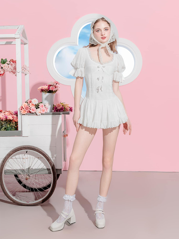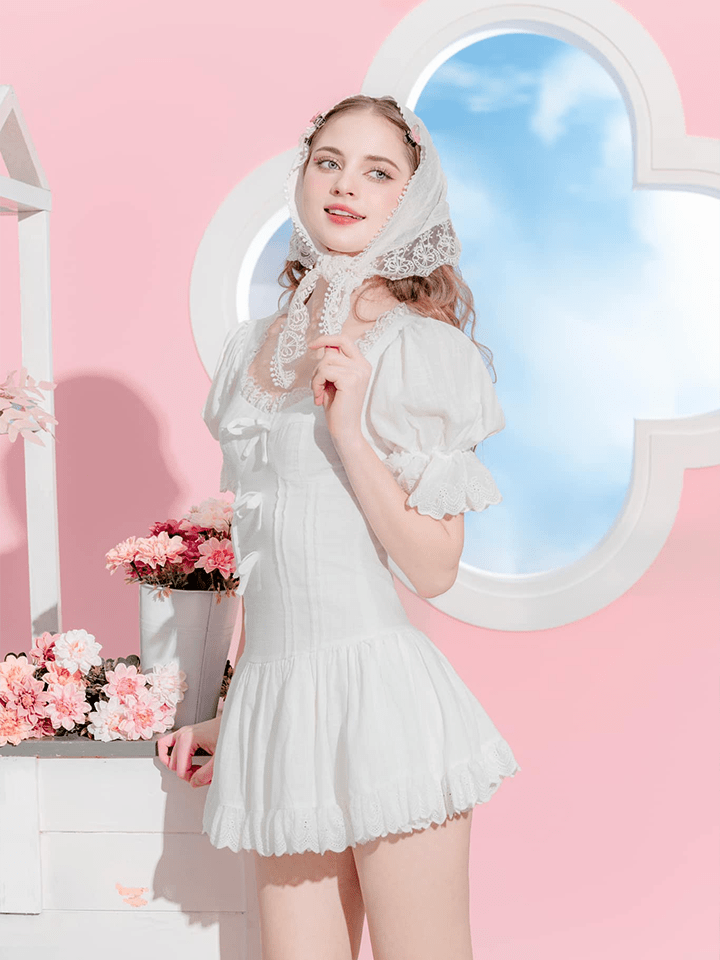 White Cottagecore Dress with Bonnet “Lace Bloom” DR835